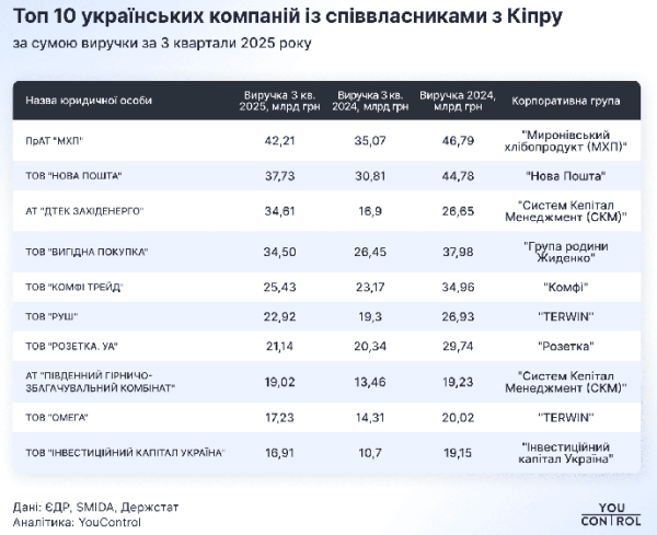 Агрофірма МХП стала лідером рейтингу українських підприємств з кіпрськими співвласниками за розміром доходу за результатами трьох кварталів 2025 року.