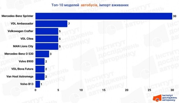Важливо, що в Топ-10 вже активно закріплюються великі європейські машини, які раніше потрапили в Україну як уживаний імпорт, а зараз змінюють власників всередині країни: це нідерландські VDL Ambassador і бельгійські Van Hool Astron. Також у переліку наявні ветерани Volkswagen LT і Crafter, місцева Рута 25, нечастий для наших країв Dodge Sprinter (американський варіант «Мерседеса») і перевірений часом ПАЗ 3205.