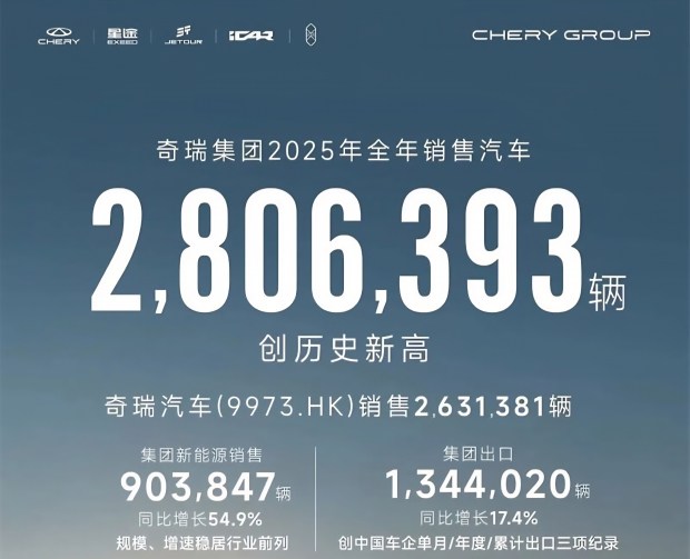 Сукупний обсяг реалізації Chery Group у 2025 році досяг 2 806 393 транспортних засобів, що на 7,8% більше, ніж у попередньому році. З цієї кількості 1 344 020 машин було відправлено на експорт, а річний приріст поставок за кордон становив 17,4%. Продажі автомобілів на нових джерелах енергії досягли 903 847 одиниць, продемонструвавши стрімке зростання на 54,9% у річному обчисленні. В результаті експорт сформував 47,9% загального обсягу реалізації компанії за рік, що підкреслює визначальну роль зовнішніх ринків у бізнес-моделі Chery.