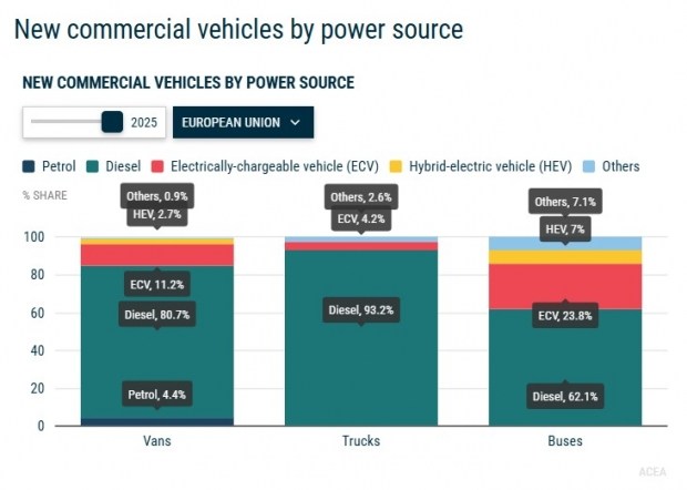 Статистичні дані ACEA показують, що на долю машин з можливістю підзарядки від електромережі в ЄС припало близько 24% всіх нових реєстрацій у 2025 році (майже 26%, якщо врахувати країни EFTA і Великобританію). Цей показник збільшився в порівнянні з минулим роком (у 2024-му він становив 18,5%, а в 2023-му – 16%). Дизельні автобуси продовжували залишатися найбільшою категорією за типами двигунів в цілому, але їхня частка зменшилася зі зростанням популярності електроавтобусів.