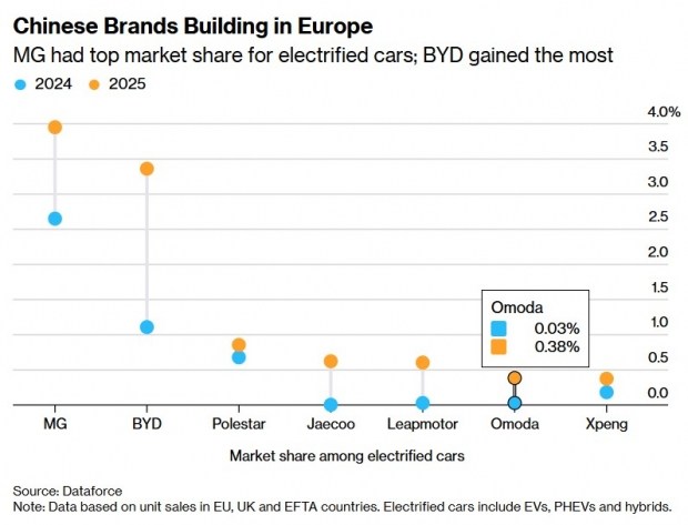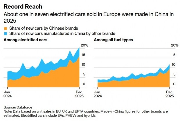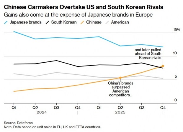 Із показником 9,5% європейського авторинку в грудні китайські марки вперше за три місяці обійшли південнокорейських суперників, зокрема Kia, показують відомості дослідницької фірми Dataforce. BYD та інші китайські підприємства готові й надалі зміцнювати позиції, оскільки торговельні обмеження зменшуються, а експортна експансія Китаю набирає обертів.