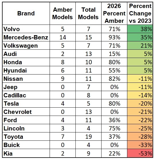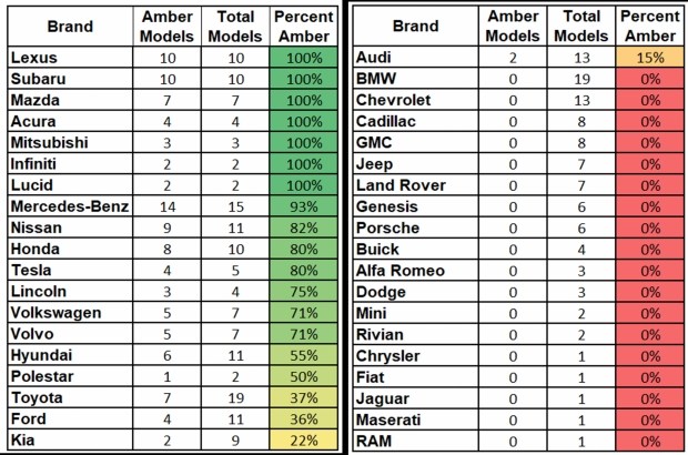 У 2026 році лише 43% моделей на американському ринку обладнані жовтогарячими задніми покажчиками повороту. Для порівняння, у звіті 2023 року таких було 48%. Тобто прогрес не тільки зупинився – він пішов у зворотний бік.