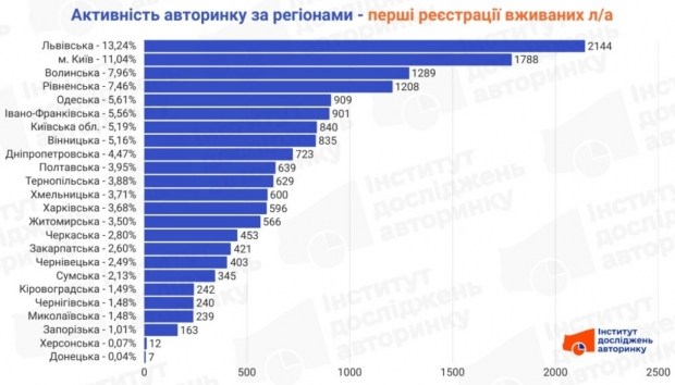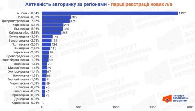 У сегменті нових автомобілів традиційно найбільша кількість перших реєстрацій нових легкових автомобілів відбулася у столиці – 1837, що становить значну частку 38,5%.