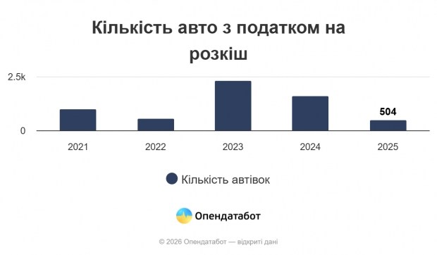 У 2025 році в Україну було імпортовано 504 автомобілі, що відповідають критеріям «податку на розкіш». Це в 3,2 рази менше, ніж було завезено у 2024 році. Це загалом мінімальний показник за останні п’ять років.