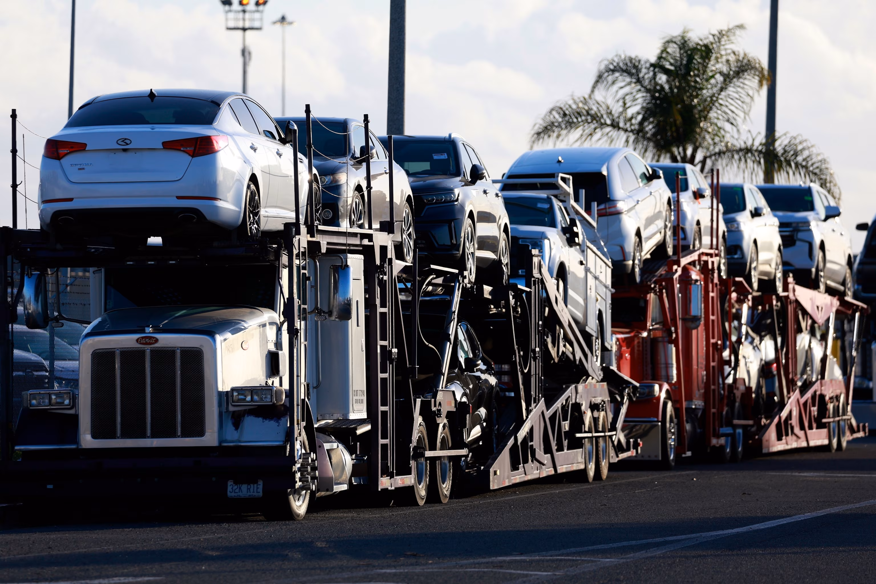 Транспортні засоби припарковані на причепах для перевезення автомобілів, готові до розподілу, на майданчику для обробки транспортних засобів у морському терміналі Національного міста, 26 квітня 2025 року, у Національному місті, Каліфорнія. Кевін Картер/Getty Images