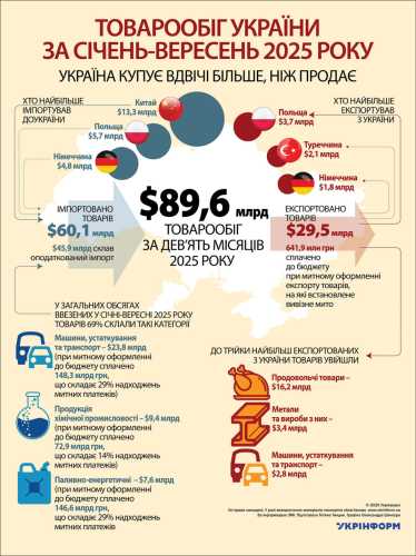 Головна Імпорт та Експорт Торговий обіг України за січень-вересень 2025 року Торговий обіг України за січень-вересень 2025 рокуINFBusiness17.10.2025Імпорт та Експорт Україна імпортує вдвічі більше, ніж експортує Згідно з даними медіа Джерело Rate this item:1.002.003.004.005.00Submit Rating No votes yet. Please wait... Попередній Запис Євросоюз затвердив оборонну ініціативу EDIP з бюджетом 1,5 млрд євро, включаючи кошти для України. Пов’язані записи Українські АЗС: вартість бензину 17 жовтня17.10.2025 На Вінниччині тимчасово зупинили виробництво на двох цукроварнях через нестачу цукрового буряку.17.10.2025 З українського морського шляху експортовано 90 мільйонів тонн збіжжя в різні держави.17.10.2025 Залишити відповідьСкасувати відповідьВаша e-mail адреса не оприлюднюватиметься. Обов’язкові поля позначені * Ім’я * Email * Додати коментар * Save my name and email in this browser for the next time I comment.Опублікувати коментар Δ