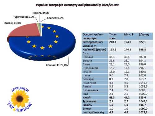 Протягом липня-серпня 2025 року в Україні було піддано переробці близько 60 тисяч тонн насіння ріпаку, що дало можливість виготовити та відправити на експорт 25 тисяч тонн ріпакової олії.