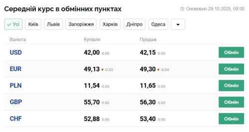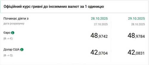 - 1 долар США – 42,08 грн (42,07 грн на 28 жовтня);