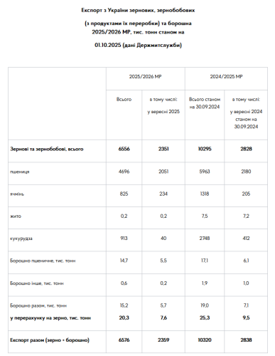 З початку 2025/2026 маркетингового року (МР), станом на 1 жовтня, Україна експортувала 6,556 млн тонн зернових та зернобобових культур, з них 2,351 млн тонн у вересні.