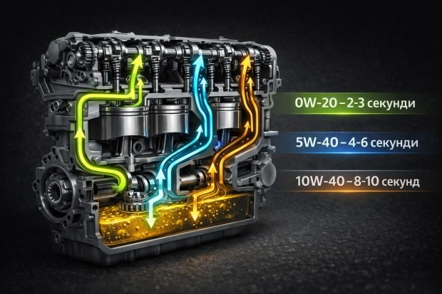• мастило класу 10W-40 може досягати цих точок лише через 8-10 секунд, а за значних морозів і довше.